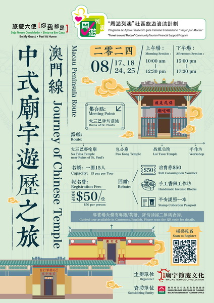 「中式廟宇遊歷之旅—澳門線」於8月17至25日期間周六日的上、下午各舉辦一場。其中8月25日設中英雙語場。參加者隨導賞員遊走澳門本島具代表性的中式文化古廟:大三巴哪咤廟、包公廟和呂祖仙院,並遊歷世遺以及在鄭家大屋體驗手工香餅工作坊。
