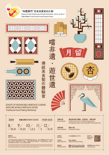 「【嚐非遺.遊世遺】傳統美食製作體驗營」包括傳統美食製作體驗、包裝設計及遊歷世遺等一系列體驗活動,豐富居民和旅客對本地美食旅遊的體驗,進一步提升澳門「創意城市美食之都」的美譽。活動於8月下旬至12月期間在鄭家大屋共舉行八場。活動費用全免,額滿即止。