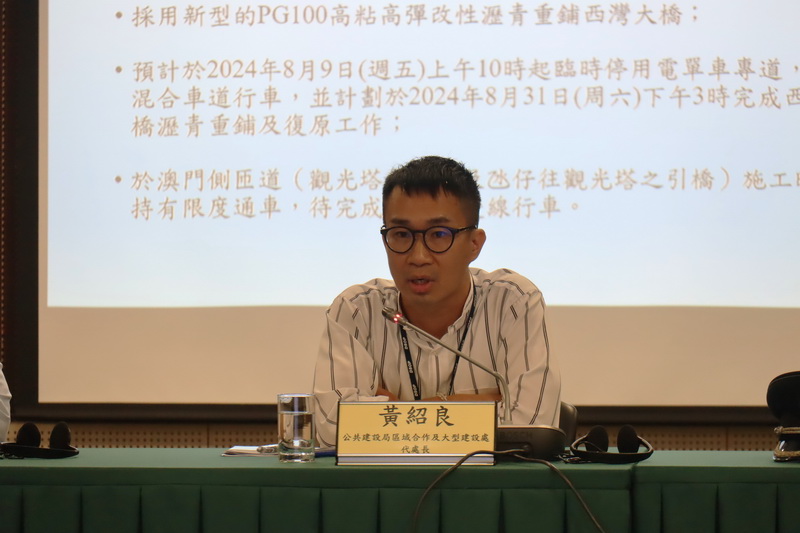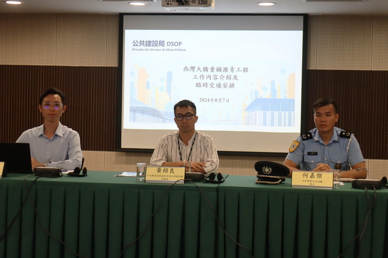 公共建設局、交通事務局和治安警察局周三舉行「西灣大橋重鋪路面工程臨時交管」新聞發佈會。公共建設局區域合作及大型建設處代處長黃紹良表示,2005年1月通車的西灣大橋啟用至今已超過19年,作為本澳第三條跨海大橋,西灣大橋每日車流量非常高,今年上半年錄得日均六萬架次,通車至今雖有進行局部緊急工程,但由於近年極端天氣較多,對大橋路面瀝青造成不同程度影響和損毁,因應今年雙慶年,並配合慶典工作,公建局計劃重鋪西灣大橋瀝青。