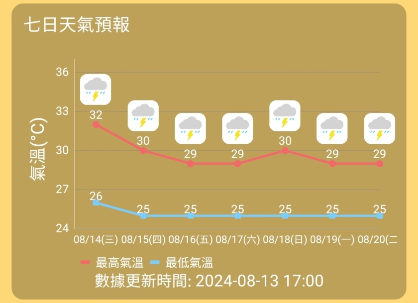 隨著一道低壓槽移近,氣象局預測周四起本澳將告別酷熱天氣,太陽將會被厚重的雨雲遮蔽,氣溫可望回落至25度至30度,但驟雨和雷暴會明顯增多,風力亦會增強至三至四級西南風及有陣風;展望周末至下周初天氣仍然多雲有驟雨及雷暴,最高氣溫約為29度至30度。