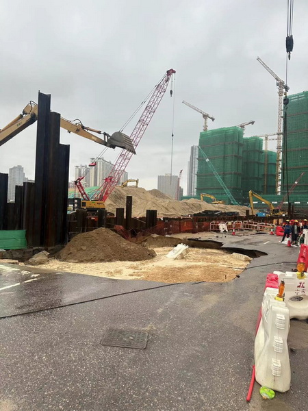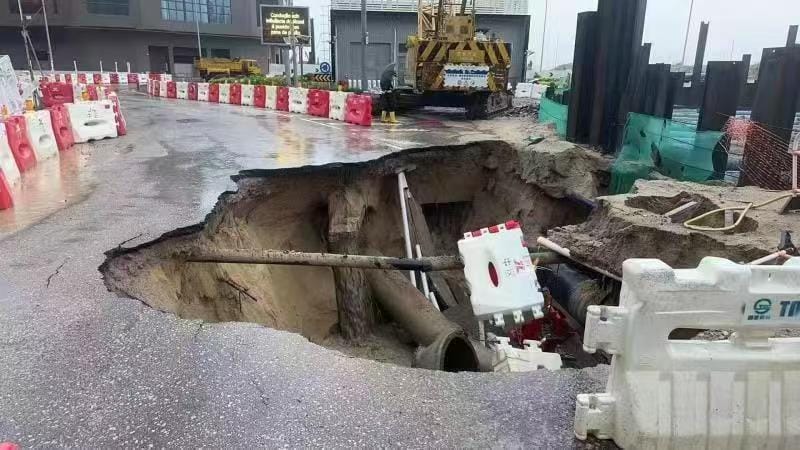 事發於周四早上約11時, 公共建設局在事後發出新聞稿指在紅色暴雨警告訊號發出期間,位於新城A區濠江圓形地及馬萬祺博士大馬路位置,已圍封並正在進行共同管道工程的工地內,一處路面出現泥土坍塌。該局對事件高度關注,已即時派員到現場了解情況。