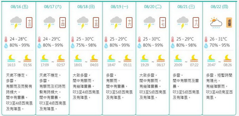 氣象局表示,受一股西南氣流影響,現時華南沿岸正被一股廣濶雲帶覆蓋,當中有雷暴區發展,並間中影響珠江口一帶,並預料8月16及17日期間本澳天氣持續不穩定及續有驟雨和雷暴,間中雨勢有時頗大,巿民應留意天氣資訊並適時做好預防措施。