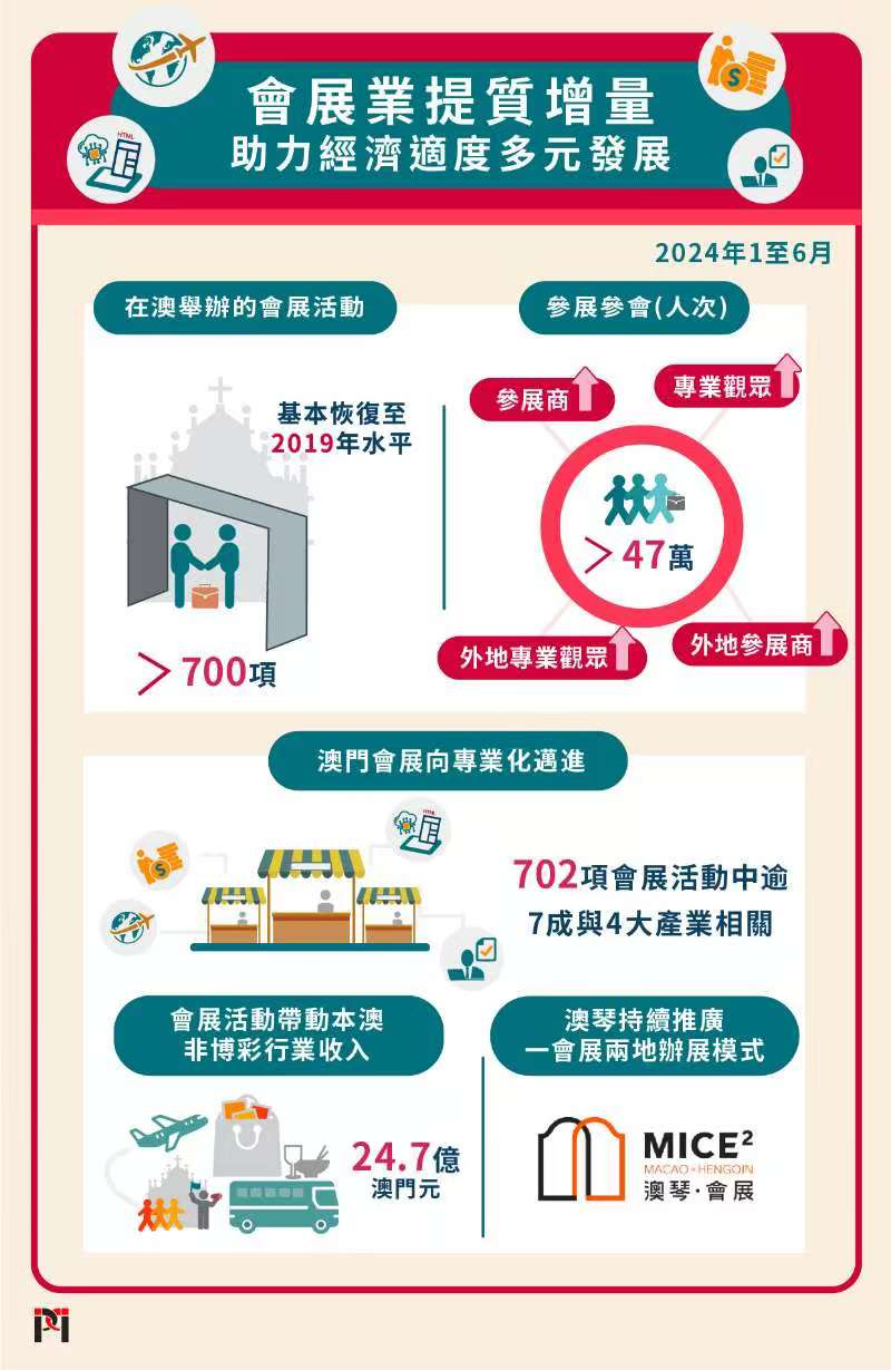 【本報消息】根據統計暨普查局資料, 2024年上半年澳門共舉辦702項會展活動。此數字已基本回復至2019年同期水平,且上半年會展活動專業化、國際化的程度進一步提升,反映澳門會展業持續加快發展。