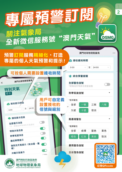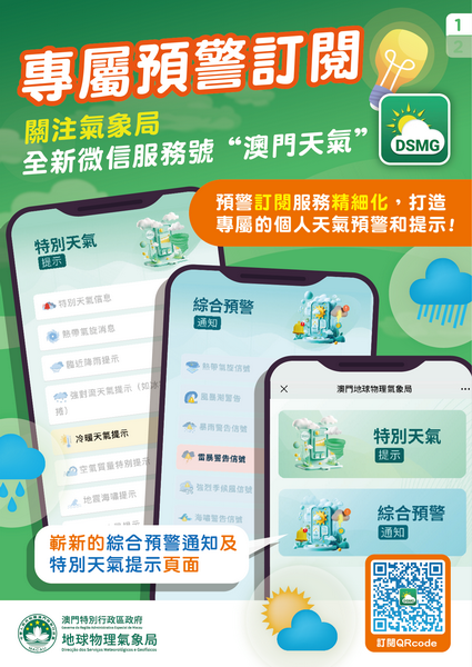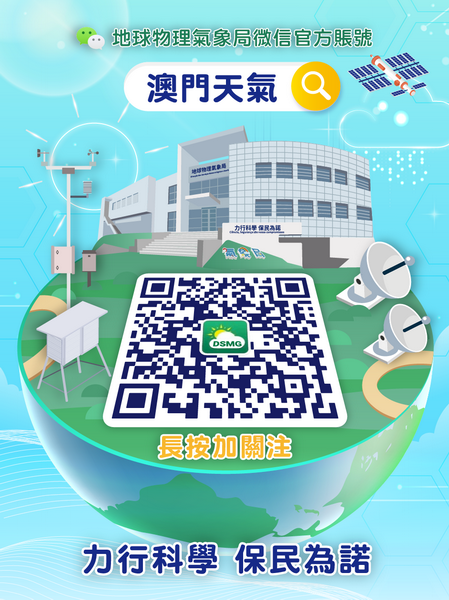 氣象局將持續檢視和優化各項訂閱功能及推送服務,並繼續致力為用戶提供更適切和貼心的氣象服務體驗。歡迎公眾自即日起於微信平台搜索「澳門天氣」官方賬號或掃描二維碼關注全新微信官方賬號,有關賬號將與原微信官方賬號「澳門地球物理氣象局」並行一段時間,而原有賬號的停止運作日期將再適時公佈。