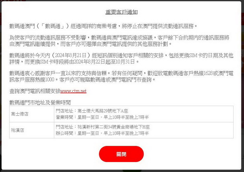 數碼通澳門21日在網站刊登通知稱,經周詳商業考慮,將停止在澳門提供流動通訊服務。通知又指為使客戶的流動通訊服務不受影響,數碼通與澳門電訊達成協議,客戶餘下合約期內的通訊服務將由澳門電訊繼續提供,而客戶亦可選擇由澳門電訊提供的其他服務計劃。