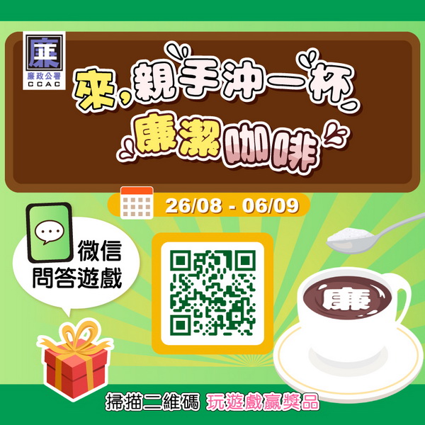 【本報消息】廉政公署為讓大眾進一步認識《預防及遏止私營部門賄賂》、《預防及遏止對外貿易中的賄賂行為的制度》等法律及廉署職能,特別推出「親手沖一杯廉潔咖啡」微信問答遊戲,期望大眾透過參與遊戲,積極參與廉政建設,知法守法,支持廉署工作,共建廉潔社會。