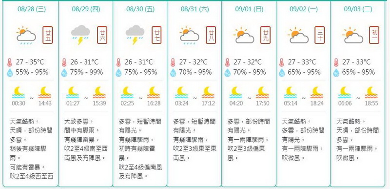 到了周末天氣持續多雲及短暫時間有陽光,並有幾陣驟雨,氣溫約為攝氏27至32度。不過到了下周初期,預料天氣會再度酷熱,多雲及部分時間有陽光,有一兩陣驟雨,最高氣溫回升至33度或以上。