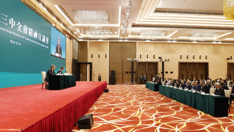 【本報消息】應澳門特區政府請求,經中央批准,中央港澳工作辦公室、國務院港澳事務辦公室邀請中央宣講團成員,全國人大憲法和法律委員會副主任委員、全國人大常委會法制工作委員會主任沈春耀,中央宣講團成員,商務部黨組書記、部長王文濤蒞臨本澳,向澳門各界宣講中共二十屆三中全會精神。由特區政府舉辦的兩場宣講會於本月28日舉行,約1,000名與會者聆聽兩位中央宣講團成員的精彩宣講。