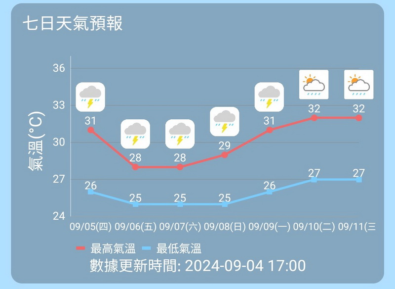 隨著「摩羯」遠離及減弱,下周初華南沿岸驟雨逐漸減少。而下周中期廣東沿岸風勢微弱,該區天氣酷熱,高溫亦會觸發驟雨。同時,預料一個廣闊低壓區會為台灣以東海域帶來不穩定天氣。