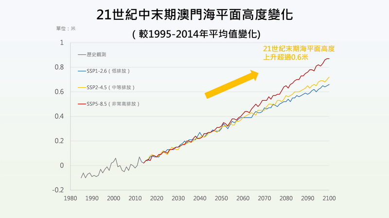 此外,研究顯示21世紀無論出現哪一種情景,澳門的海平面高度均會有所上升。當中在中等排放情景下,21世紀中期(2041-2060年),澳門的海平面高度將較1995-2014年的平均值上升約0.31米,21世紀末期(2081-2100年)更預計會上升約0.64米。可以預見,因應海平面高度的上升,將加劇本澳受天文大潮和風暴潮的影響。