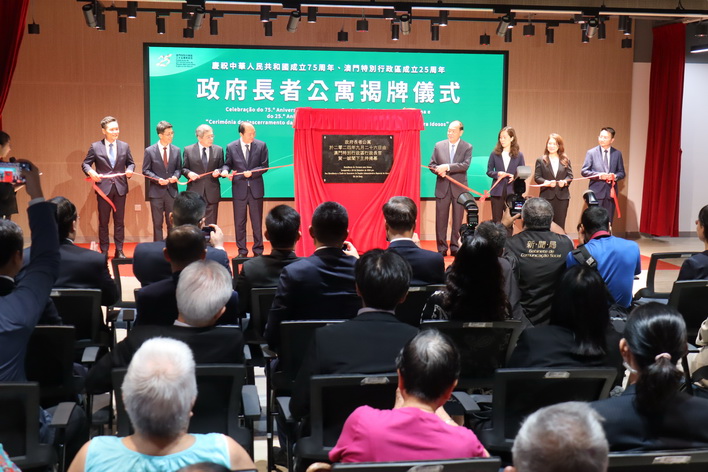 今屆政府正式拍板並動工興建的長者公寓周四下午四時舉行揭牌儀式,儀式安排在大樓二樓粵劇室內進行,行政長官賀一誠、中聯辦主任鄭新聰、社會文化司司長歐陽瑜、運輸工務司司長羅立文等官員出席並共同為長者公寓揭牌。