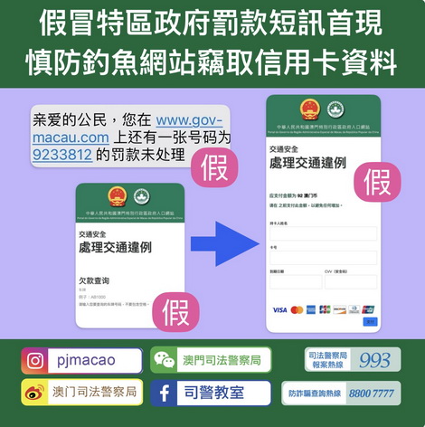 【本報消息】司警局於近日發現有騙徒假冒澳門特區政府名義向市民隨機發送虛假手機短訊,訛稱市民有罰款需要點擊短訊內附帶之連結處理,有關連結進入後為一個假冒「澳門特別行政區政府入口網站」的網頁,倘市民按照頁面要求輸入車牌號碼查詢後,會訛稱市民有「交通違例」罰款需要透過信用卡繳交,以此套取市民信用卡資料後隨即進行未經授權之大額交易,令市民蒙受損失。