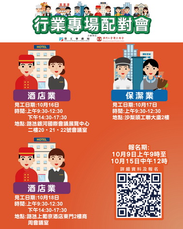10月18日全日舉辦酒店業配對會,提供59個職位空缺,涉及貴賓服務主任、公共區域主任、前台服務員、穿梭巴士服務專員、司膳員等。配對會在澳門上葡京二樓商周會議室舉行。