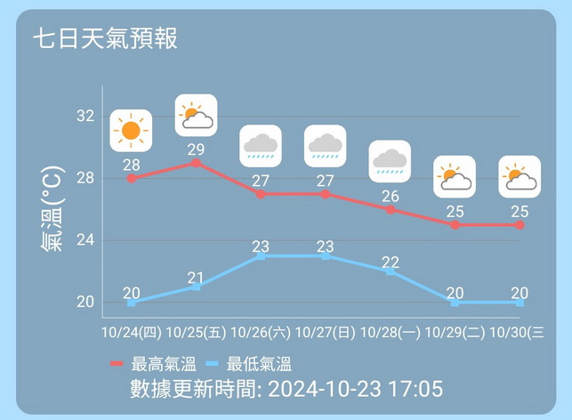 展望下周二起驟雨將會減少,多雲但短暫時間有陽光,但要留意最低氣溫將再次下降至約20度,最高溫度也只有25度,居民要注意帶備外套適時防風保暖。