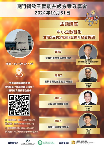 【本報消息】由生產力暨科技轉移中心、澳門餐飲行業協會合辦,經濟及科技發展局支持的「澳門餐飲業智能升級方案分享會」,將於10月31日在中葡綜合體舉行,分享會探討有關電子商務、設備如何協助餐飲業者加速數位轉型方面的內容,費用全免。歡迎業界及有興趣人士報名參與。