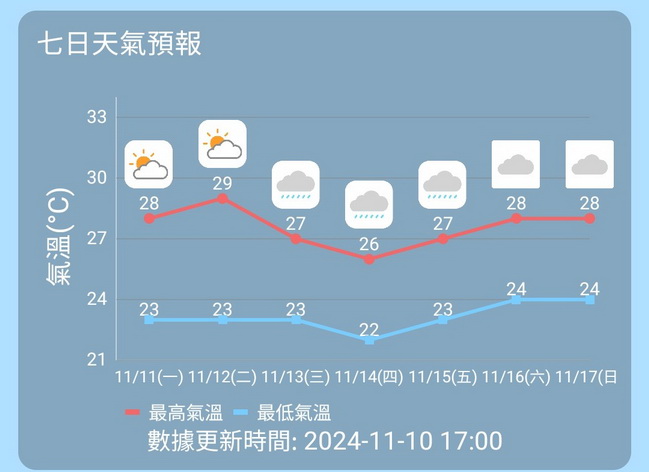 氣象局預測本澳周一多雲,部份時間有陽光,吹三至四級東至東北風,氣溫約為攝氏23度至28度,相對濕度介乎百分之60至90之間,最高紫外線指數約為七,級別屬於高。周二陽光會稍微增多,最高氣溫會上升至29度。周三起本澳轉為大致多雲天氣,且稍後會有幾陣驟雨,吹三至四級東至東北風,間中五級有陣風,目前預料周四風力達四至五級東至東北風,並且仍然有雨,周五才略減至吹三至四級偏東風。展望周末至下周日天氣大致多雲,氣溫介乎24度至28度。