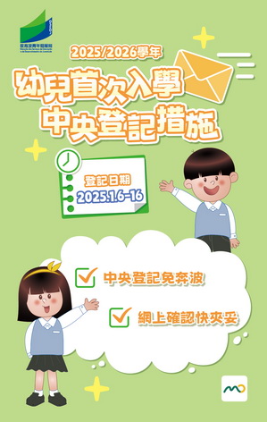2025/2026學年中央登記將由2025年1月6日至16日接受登記,準備在2025年9月入學的幼兒,其家長須在子女的一戶通/教青局網頁上填報基本資料、上載幼兒近照電子檔(正面免冠證件相片格式),以及應所選學校的要求,提供所需的資料。完成登記後,學校會通知家長面談的日期及時間。