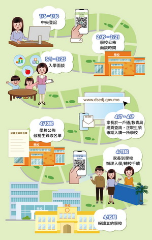 【本報消息】教育及青年發展局將於2025年1月繼續實施「幼兒首次入學中央登記措施」,2020年至2022年出生且首次於澳門報讀幼兒教育階段的幼兒,須按2025/2026學年措施日程,經中央登記辦理報名。為方便到學校面談及辦理入學手續,家長可於登記後取得「面談二維碼」和「首次入學二維碼」。
