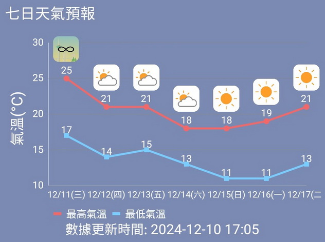 根據氣象局未來七日天氣預測,由周四開始東北季風將會再度增強,但會維持多雲及部份時間有陽光的天氣,當日氣溫會下降至14度至21度,吹三至五級北至東北風及有陣風,周五最低氣溫會微升一度至15度,周六北風將會增強至六級,氣溫亦會再度下降至13度至18度,但天色會較早兩日明朗,天晴為主,部份時間多雲。