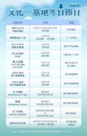 有關文化局冬日系列活動詳情可瀏覽文化局網頁、Facebook專頁、微信公眾號及澳門活動網「享澳門」。歷史片區系列活動可留意有關企業網頁。