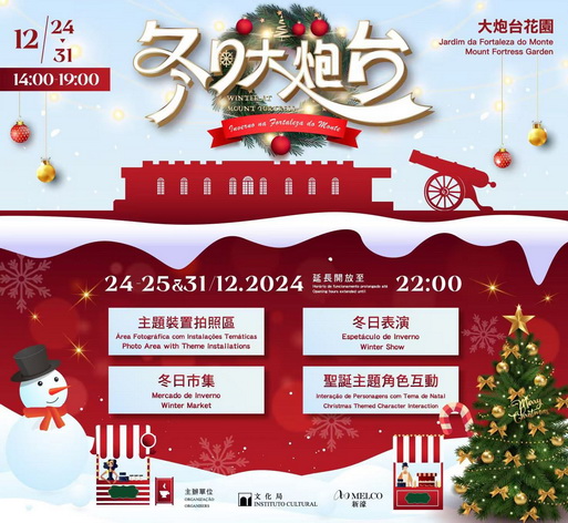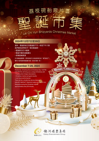 另外,銀娛於12月期間在荔枝碗船廠片區X11-X15設置聖誕裝置,逢周六、日及12月24日至25日下午1時至6時設有聖誕市集。新濠將於12月24日至31日期間在大炮台花園舉行「冬日下的大炮台」,場內設有與澳門博物館共同設計的大型節日裝置拍照區及節日燈飾,並設特色小食攤檔,以及多場現場音樂表演。美高梅於澳門媽閣塘片區分別設有大鐵棚食堂、《cAI:靈魂掃描》展覽、張藝謀導演工作室揭秘《澳門2049》、藝術動物園快樂彩「熊」奇兵團充氣遊樂園等多元活動。