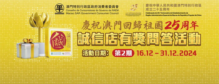 【本報消息】為慶祝澳門回歸祖國25周年,消費者委員會推出「誠信店」有獎問答活動,向本澳居民及旅客推廣「誠信店」優質標誌,打造澳門誠信與優質的消費形象。首期活動已於上月結束,第二期由即日起至本月31日期間推出,歡迎有興趣人士參與。