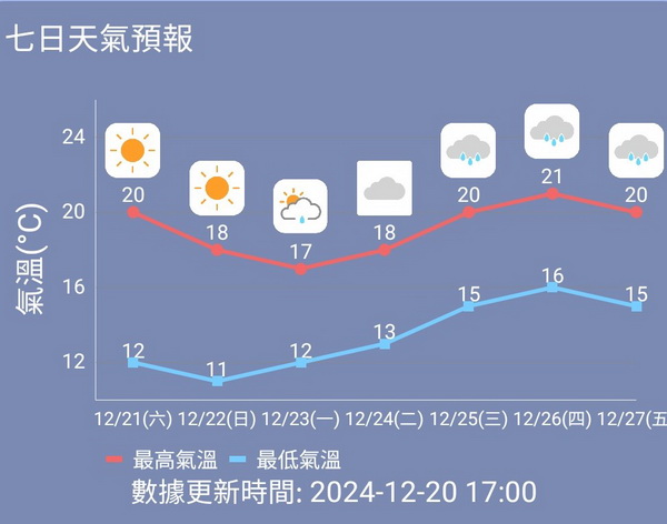 下周二平安夜起本澳將完全轉為多雲的天氣,氣溫約為13度至18度,下周三聖誕節更開始有幾陣微雨,但氣溫將會有所上升,料下周中至後期氣溫介乎15度至21度,相對濕度也會上升到百分之55至90之間。