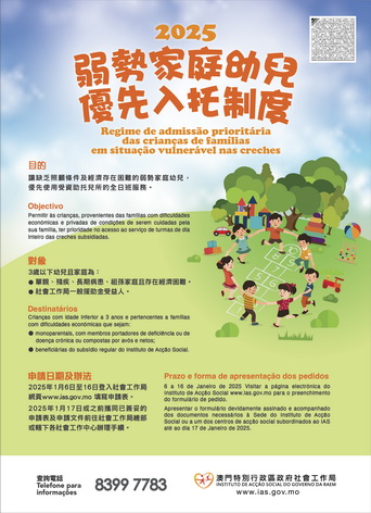 【本報消息】社會工作局協調受資助托兒所推行的「弱勢家庭幼兒優先入托制度」將於2025年1月6日起接受申請。有關制度為缺乏照顧條件及經濟存在困難的弱勢家庭幼兒,優先提供受資助托兒所全日班服務。