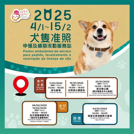 犬隻准照申領及續期流動服務站舉辦地點包括路環石排灣業興大廈、塔石廣場、白鴿巢公園前地、黑沙環公園及氹仔運動場圓形地,流動站亦將新增領養查詢攤位,便利有意領養人士瞭解待領養動物資料及領養前準備事項。