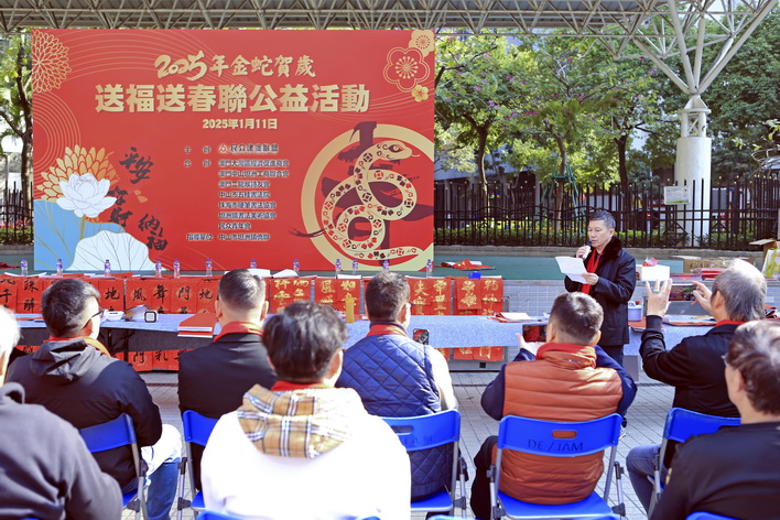 【本報消息】新春佳節,金蛇賀歲,為進一步推動社區和諧共融,豐富居民節日文化生活,營造歡樂祥和的節慶氛圍,由民眾建澳聯盟主辦,澳門大灣區經濟促進商會、澳門中山坦洲工商聯合會、澳門二龍喉詩友會、中山市五桂書法院、珠海市硬筆書法協會、坦洲鎮書法美術協會、民眾青年會合辦的「2025金蛇賀歲送福送春聯公益活動」於上周六在祐漢公園舉行,現場十多位書法家揮毫潑墨,為居民書寫寓意吉祥的春聯和福字,送上新春的美好祝福。