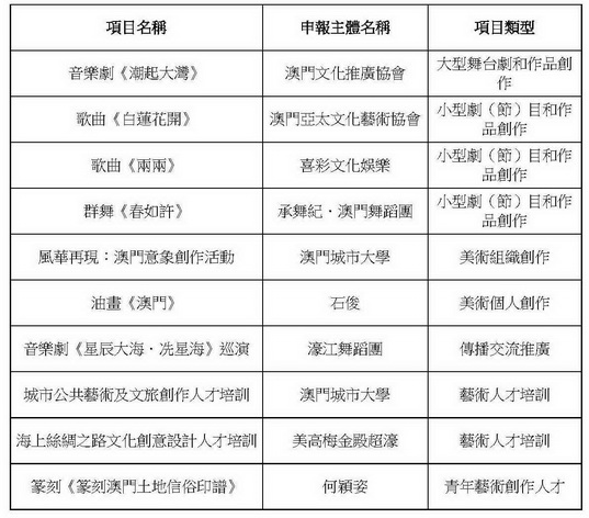 本澳入選的項目中,分別有一項大型舞台劇和作品創作,三項小型劇(節)目和作品創作,兩項藝術人才培訓,而美術組織創作、美術個人創作、傳播交流推廣及青年藝術創作人才各有 一個項目。相關項目獲得國家藝文評審機制認可,為澳門藝文業界提供更多資源和平台,有助促進澳門藝文界的多元及專業化發展。
