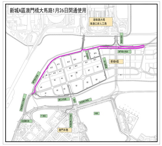 【本報消息】新城A區東側的澳門橋大馬路部分行車線將於1月26日開通,屆時由澳門半島進入港珠澳大橋口岸及澳門大橋的車輛需使用新建的澳門橋大馬路,行車動線會比現時更加便捷,而鏡海大馬路將於同日起臨時封閉只予進入地盤及特許車輛行駛,請駕駛者留意現場交通指示及改道後的行車路線。