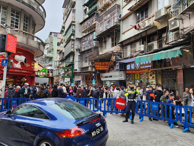 年初六截至下午五時入境旅客有14.2萬人次,較年初五同期減少兩萬多人次,繼續呈下降趨勢,但人數已超過平日甚至是周末假期,由於大量旅客繼續紛至沓來,警方於下午2時20分連續第五日在大三巴街實施單向人潮管制措施,措施至下午3時50分結束,歷時約一個半小時。