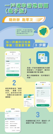 為進一步推進電子政務,「地籍圖(電子版)」申領服務已全面整合至一戶通平台,市民可透過手機應用程式或網頁版登入一戶通,完成申請、繳費及領取地籍圖(電子版),申請需時五個工作天。