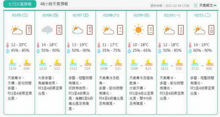 預料周四大致多雲及有幾陣微雨,吹三至四級東至東北風,氣溫介乎14度至18度;周五多雲及短暫時間有陽光,初時有微雨,當日最高氣溫進一步稍為回升至19度左右。