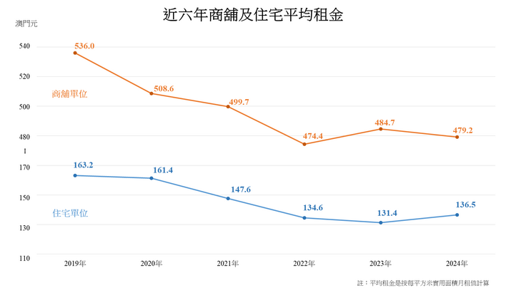 【本報消息】統計暨普查局資料顯示,2024年商舖單位每平方米實用面積平均租金為479元澳門元,較2023年下跌1.1%;辦公室單位293元及工業單位123元,按年跌幅為2.8%及0.1%;住宅單位平均租金則按年上升3.9%至137元。
