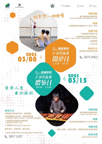 音樂學校體驗日將於3月15日上午九時在高士德大馬路14-16號澳門演藝學院內舉行。活動對象為對音樂有興趣及有志踏上音樂專業學習之路的小六及初中學生,有意者可由即日起至3月5日發送電郵至HKLam@icm.gov.mo報名參加。活動將安排已報名的學生參與專業主修課、視唱練耳課、音樂表演、合唱課及課程講解會等內容,讓參與者瞭解「表演藝術班」課程的教學模式及特色,體驗音樂表演藝術專業的學習生活。