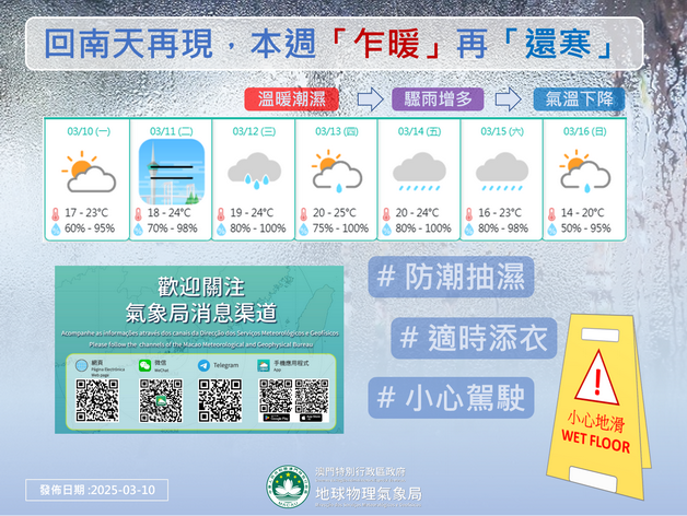 隨著該道冷鋒於周末期間通過廣東沿岸,一股東北季風將會影響本澳,屆時北風將有所增強、氣溫將再度下降。鑑於預料未來一周本澳將再度出現「乍暖、還寒」的天氣。此外,由於未來數日潮濕有霧,能見度較低,氣象局提醒公眾做好防潮措施及小心駕駛,注意適時添衣,並關注局方的最新天氣資訊。