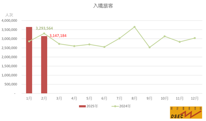 2025年首兩個月的入境旅客共6,793,745人次,按年上升10.4%;不過夜旅客(4,043,105人次)增加20.8%,而留宿旅客(2,750,640人次)則減少2%。首兩個月旅客累計平均逗留時間較去年同期縮減0.2日,留宿旅客(2.2日)與不過夜旅客(0.3日)維持不變,整體平均逗留時間縮短主要是不過夜旅客佔比按年上升所致。