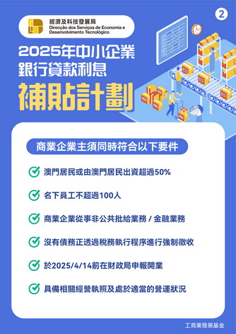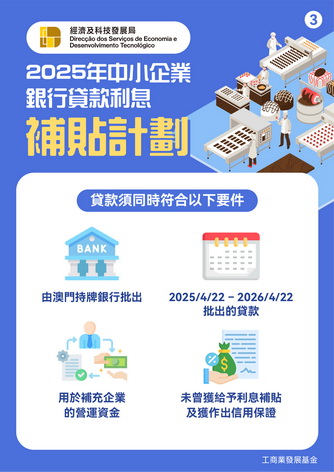 凡符合資格的中小企業,於2025年4月22日至2026年4月22日期間,獲得由澳門持牌銀行批准用於企業營運的資金貸款,可透過銀行申請貸款利息補貼,每一商業企業主的貸款額上限500萬澳門元,補貼期最長三年,年補貼率上限四厘,銀行貸款額總額上限100億元。