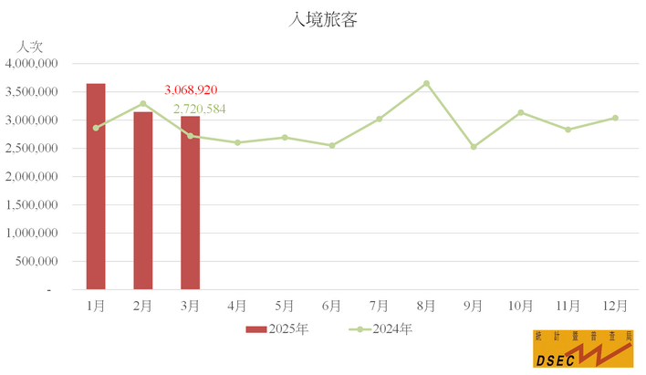 另外,三月入境旅客共3,068,920人次,按年上升12.8%;不過夜旅客(1,780,279人次)及留宿旅客(1,288,641人次)分別增加23.3%及0.9%。旅客平均逗留時間較去年同期減少0.1日至1.1日;不過夜旅客(0.2日)與留宿旅客(2.3日)的均維持不變。