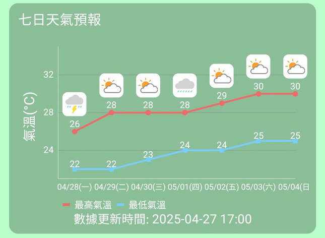 不過預測周四五一勞動節當日本澳將會再專為多雲並且會有幾陣驟雨天氣,當日氣溫約為24度至28度;展望周末至下周初天色略為改善,日間陽光會增多,但仍有機會會有一兩陣驟雨,日間氣溫會回升至約30度。