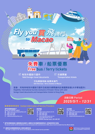 旅遊局再度攜手「香港機場客運服務(澳門)股份有限公司」、「信德中旅船務管理(澳門)有限公司」(噴射飛航)及「金光渡輪有限公司」(金光飛航),於2025年5月1日至12月31日期間向到訪香港的國際旅客提供免費跨境交通票務優惠,持續刺激國際旅客到澳門旅遊的意欲,擴大客源。合資格的旅客辦妥指定手續即可免費獲贈從香港往澳門的單程車票或船票。