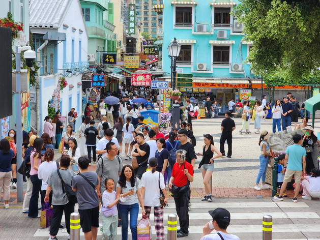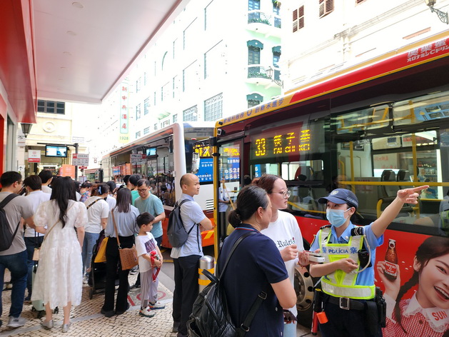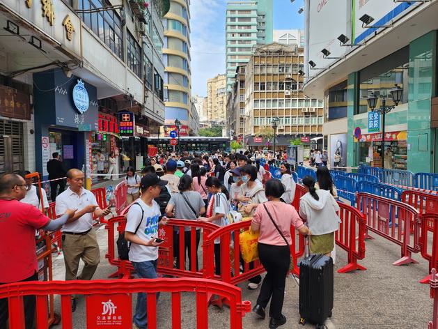 五一假期連日來本澳各個旅遊區都人流如鯽,各政府部門執行事前準備的預案迎接大批旅客人流,其中假期首四日警方連續每日在大三巴街實施單向人潮措施,行人只可單向上行前往牌坊,並需取道大關斜巷、關前後街和高園街等街巷離開。上周五假期第二日亦因應新馬路部分路段人流擠擁,午後警方一度封閉新馬路由龍嵩正街至市政署前部份車道作臨時行人通道,以便疏導人流。