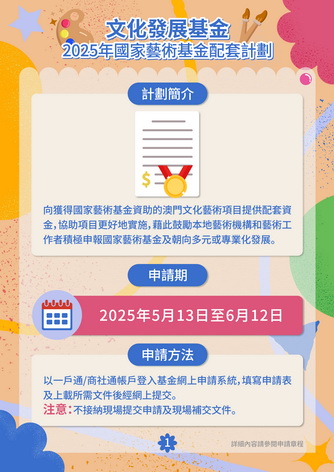 資助計劃採用補貼形式,名額不設上限。為進一步支持本澳獲國家藝術基金資助的項目順利推進,2025年文化發展基金將加大配套資助力度,比例由原來的50%提升至1:1,同時資助範圍及資助期保持與國家藝術基金資助的項目一致。申請詳情請參閱資助計劃章程,如有疑問可致電2850 1000或電郵ac@fdc.gov.mo查詢。
