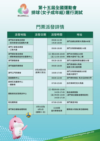 如欲參閱更多賽事資料,可瀏覽賽事官方網頁www.2025nationalgames.gov.mo。同時,歡迎關注15運會澳門賽區Facebook 專頁及全運會殘特奧澳門賽區微信公眾號。