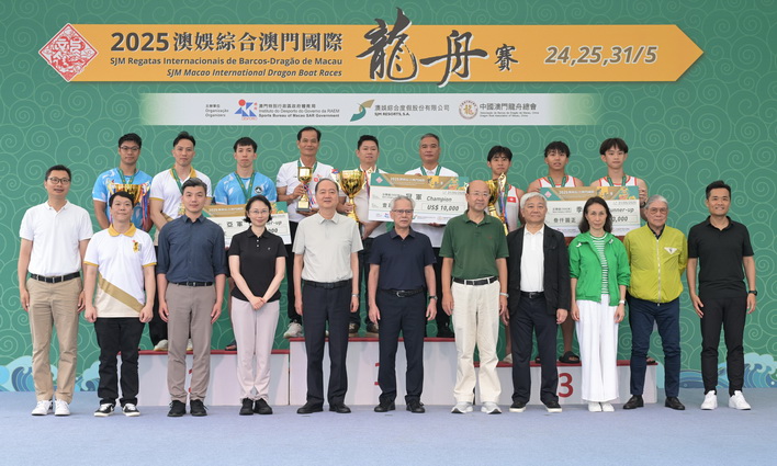 【本報消息】由體育局、澳娛綜合及中國澳門龍舟總會主辦,市政署及行政公職局協辦的「2025澳娛綜合澳門國際龍舟賽」,端午節正日於南灣湖水上活動中心進行壓軸的賽事。最終中國南海九江再度衛冕澳門國際龍舟邀請賽標準龍公開組(500米)及女子組(500米)冠軍,並刷新兩組賽事紀錄;大學生邀請賽標準龍公開組(500米)由泰國國家體育大學奪得。行政長官岑浩輝出席活動觀賞龍舟賽事,並主持點睛儀式及頒獎。