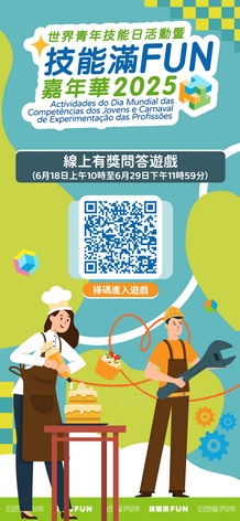 【本報消息】每年7月15日為聯合國訂立的「世界青年技能日」,以彰顯技能培訓的重要性,期望鼓勵青年透過學習技能,拓闊職涯發展。為響應「世界青年技能日」,勞工事務局及澳門青年發展服務中心合辦、新青協協辦「世界青年技能日活動暨技能滿FUN嘉年華2025」活動,並推出線上有獎問答遊戲,是次問答遊戲由6月18日(10時)至29日(23時59分)期間舉行,歡迎市民踴躍參加。