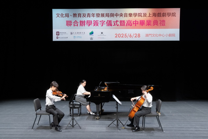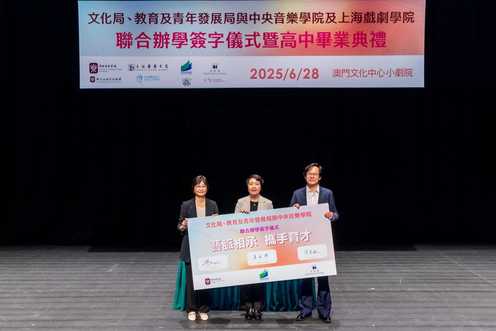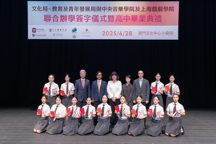 【本報消息】文化局、教育及青年發展局與中央音樂學院及上海戲劇學院於上周六在澳門文化中心小劇院舉辦聯合辦學簽字儀式,同日並舉行文化局澳門演藝學院舞蹈學校第八屆舞蹈職業技術高中畢業典禮,以及音樂學校第12屆音樂職業技術高中畢業典禮,一眾嘉賓、師生、家長出席及見證。