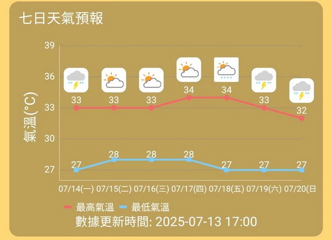 根據本澳氣象局的未來一周天氣預測,由周一起本周初期天氣持續酷熱,最高氣溫在33度或以上,市區再高一兩度,多雲及部份時間有陽光,間中有一兩陣驟雨,周一本澳大致多雲,部份時間有陽光,有幾陣驟雨及上有幾陣雷暴,吹三至四級西南風及有陣風,氣溫介乎27至33度,相對濕度介乎百分之65至95之間,預測最高紫外線指數約為12,級別屬於極高。